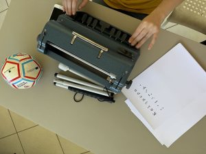 Στην πρώτη φωτογραφία απεικονίζονται τα αντικείμενα που χρησιμοποιούνται σε κάθε σχολική επίσκεψη, μία γραφομηχανή, ένα λευκό μπαστούνι, μερικές κόλλες Α4 που γράφουν τη λέξη «Καλημέρα» αποδοσμένη και σε Braille, καθώς και η μπάλα «a ball for all».